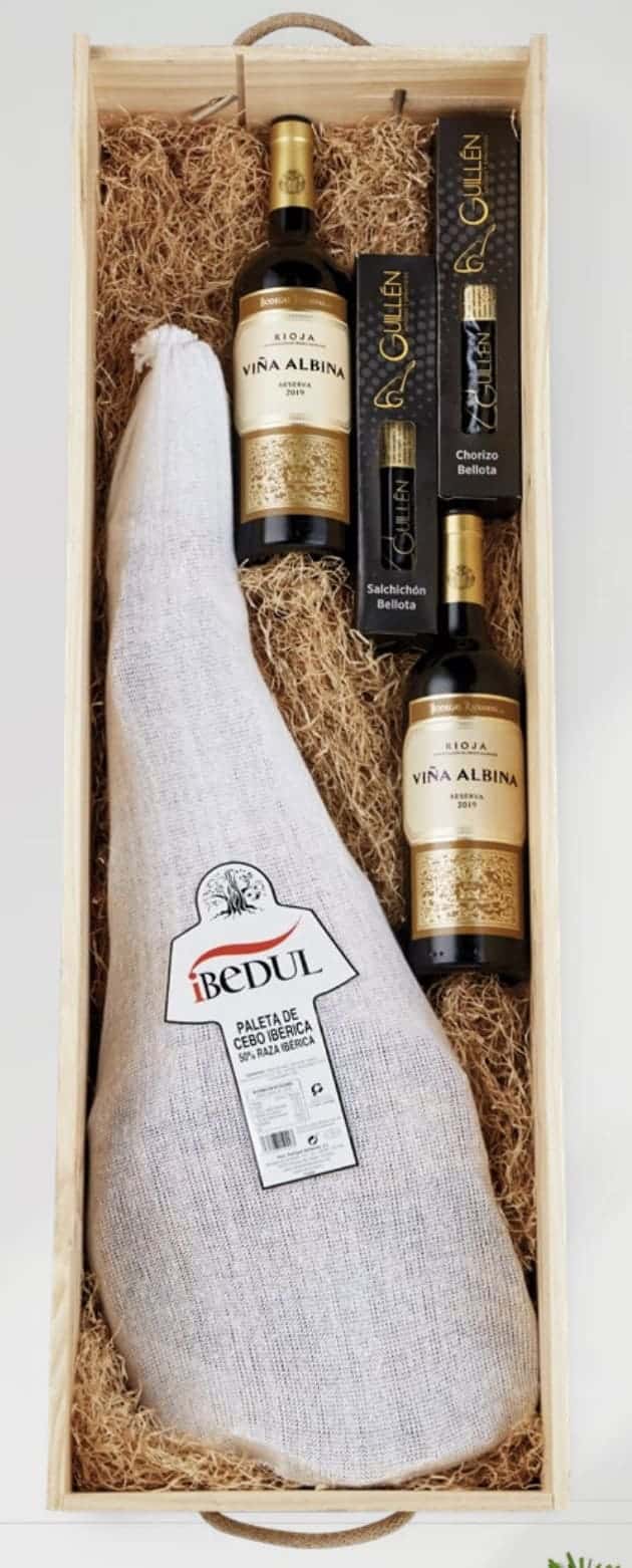 ¿Qué se encontrarán al abrir la caja? Salchichón ibérico acompañado de chorizo ibérico, una estupenda paleta ibérica de cebo y una selección de dos botellas de vino tinto.