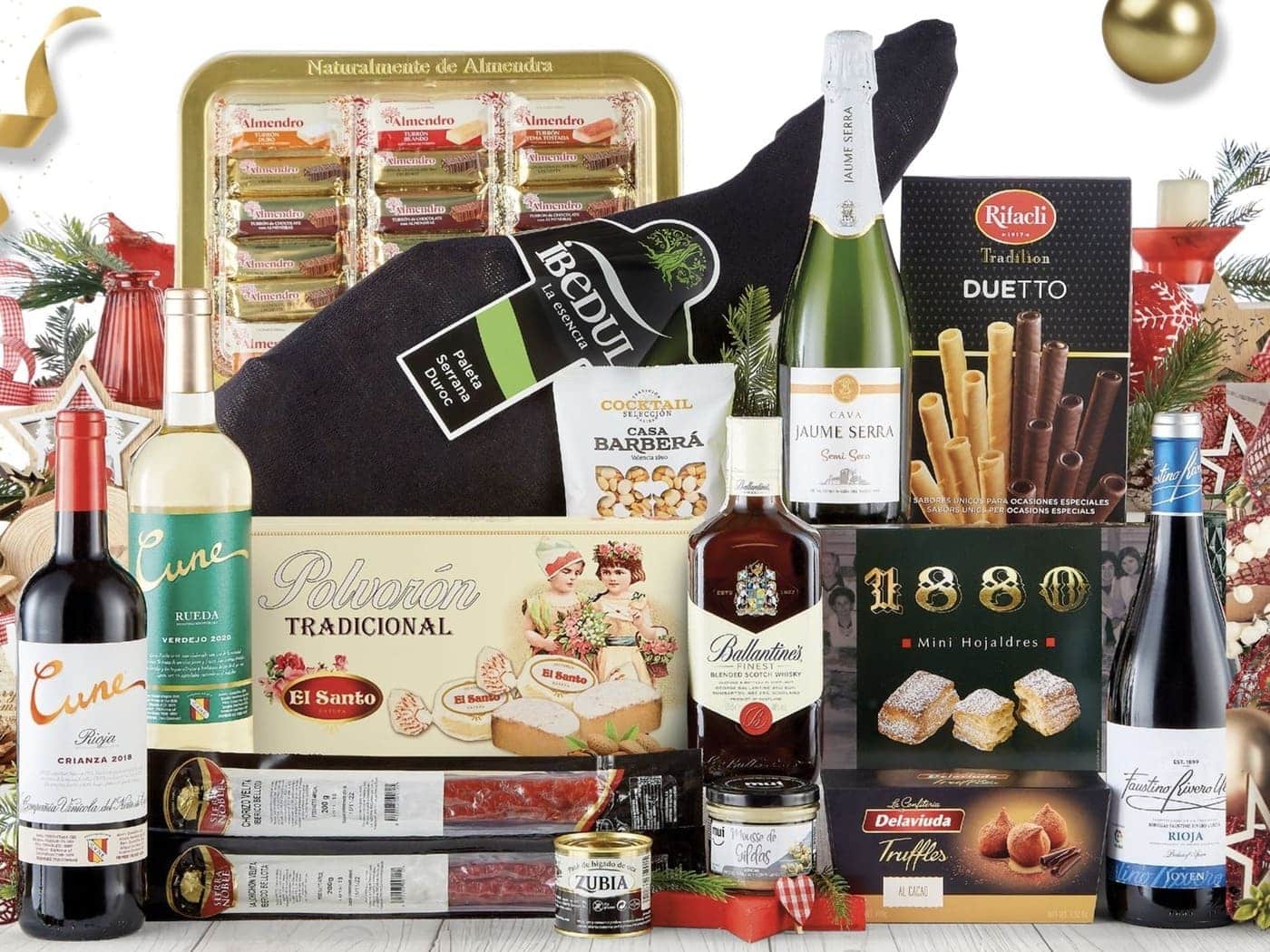 En nuestro lote de navidad número 13 podrás encontrar embutidos ibéricos, queso, diferentes vinos, cava, whisky, además de una selección de turrones, trufas, mini hojaldres, polvorones, barquillos, paté, mousses y un surtido de frutos secos selectos.